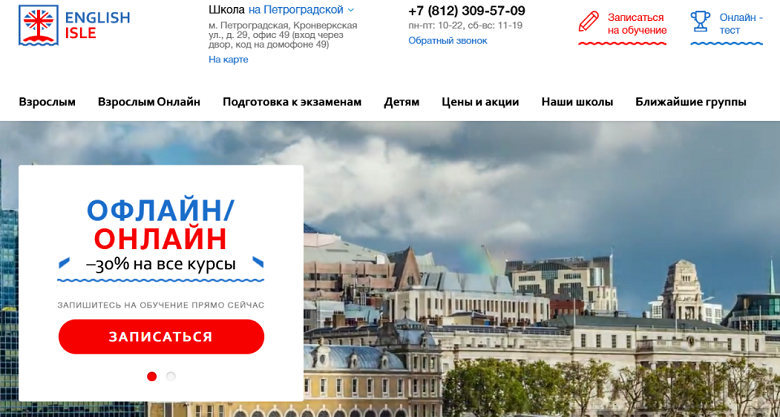Школа имеет 2 филиала в Санкт-Петербурге — занятия для детей доступны только в очном формате. Помимо общего курса можно пройти дистанционную подготовку к экзаменам (FCE или CAE) и бизнес-направление (для студентов уровня Intermediate и выше). Минимальная стоимость одного индивидуального урока составляет 1 400 ₽. При занятиях в группе ценник ниже, но придется внести оплату сразу за весь период обучения.