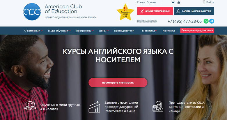 Центр American Club of Education работает больше 25 лет и предлагает очные курсы английского языка с носителем в Москве, а также программы дистанционного обучения для учеников любого уровня. Заниматься можно как индивидуально, так и в группах от 4 до 7 человек. При желании вы можете сформировать компанию из друзей и знакомых, чтобы снизить стоимость обучения.
