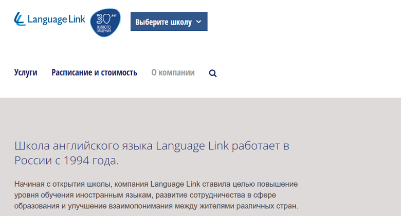 Центр Language Link больше 30 лет обучает языкам в России и Казахстане. Можно записаться на очное обучение английскому с носителем языка в Москве, Подмосковье, Санкт-Петербурге, Самаре и Черкесске. Также школа предлагает уроки в режиме онлайн. Дистанционно можно проходить общие практические курсы начального, среднего и продвинутого уровня, а также профильные программы: подготовка к международным экзаменам, деловой английский.